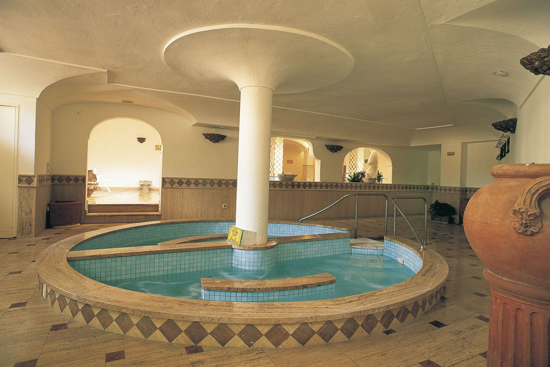 All of the spaces, from the pool to the massage booths, are marked by an elegant imperial style with austere furnishings, busts and statues, capitals and marble fountains. But the thing which sets our thermal baths apart the most is the purity and quality of our spring water which is continuously subjected to checks and scientific analysis.